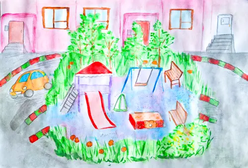 За моим домом есть детская площадка, с которой у меня связаны тысячи и тысячи воспоминаний, там я чувствую умиротворение и радость, поэтому я решила нарисовать именно её.