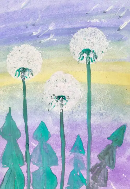 Картина написана в акварельной технике. Ребенок изобразил переход от "желтых" одуванчиков в "белые" возле своего дома. Ребенка это очень завораживает и поэтому она решила изобразить именно это.