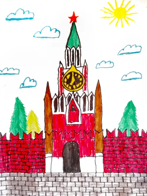 Посередине нарисован Кремль со стенами, за стенами находятся ёлки. На заднем фоне нарисовано солнышко с облаками и дорошка из плиток. Рисовал фломастерами.