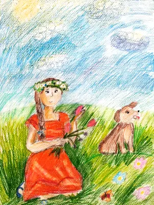Очень люблю тёплые летние дни в моем городе! На картине изображена моя мама на полянке недалеко от дома. Солнце, цветы, бабочки и мой любимый питомец.