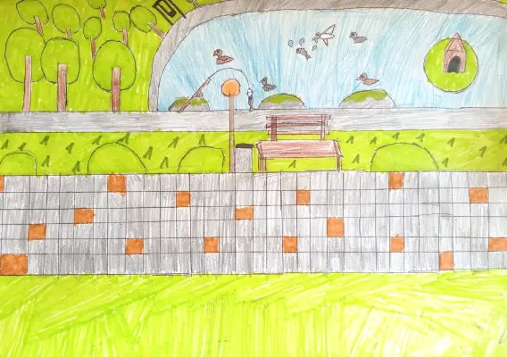 Нарисован парк с дорожкой, на верхнем правом углу нарисован Ангарский пруд срыбами и птицами, качелями, деревьями и скамейкой, там можно порыбачить для разнообразия дел. Нарисована эта работа карандашами, фломастерами, ручкой.