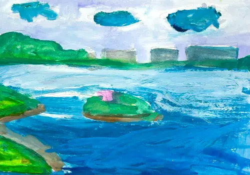 На картине изображено любимое и самое красивое место в моём районе - Гольяновский парк и пруд. Всем очень нравится там гулять в хорошую погоду.