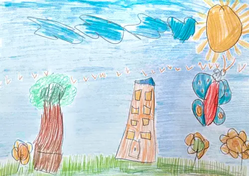 Работа выполнена в акварельной технике. Вот как ребенок видит свой дом, любимый, красивый, уютный, высокий и бесконечно родной. У каждого из нас в сердце есть именно такой дом.