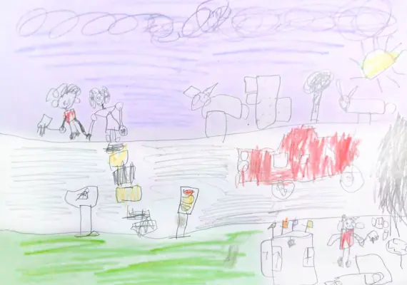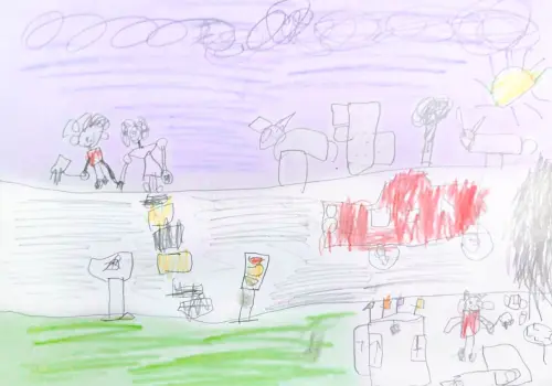 На рисунке изображён момент, когда ребёнок идёт через пешеходный переход в парк вместе с мамой. На лице ребёнка и мамы — улыбки, что передаёт атмосферу спокойствия и радости от прогулки. На другой части рисунка можно увидеть другого мальчика, который уже ждёт первого ребёнка в парке. Вокруг — элементы улицы: машины, деревья, игровая площадка или скамейки, собачки.