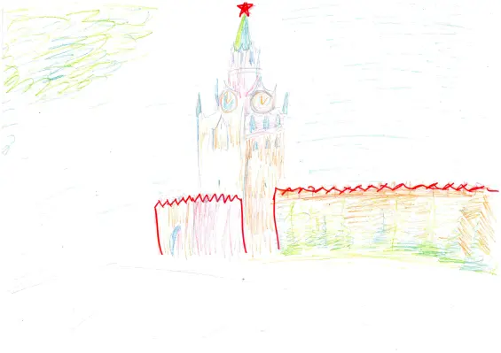 На рисунке изображено одно из самых красивых мест города Москва, известное во всем мире - Красная площадь. На фоне голубого неба Спасская башня Кремля с красной звездой и часами-курантами. Это мое самое любимое место в моем городе.