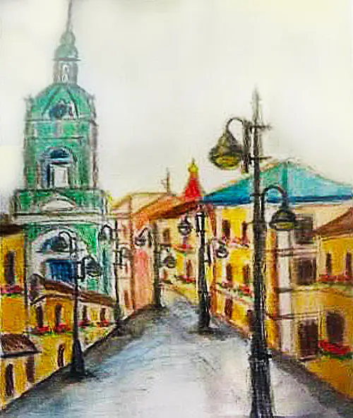 На рисунке изображена тихая и уютная улочка в районе, где жизнь течёт спокойно и размеренно. Дома с яркими фасадами и небольшими палисадниками создают ощущение тепла и домашнего уюта.
