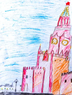 Моя работа выполнена карандашом, цветными карандашами. Я очень люблю Красную площадь - это главное место нашей страны. На рисунке я изобразил Спасскую башню.