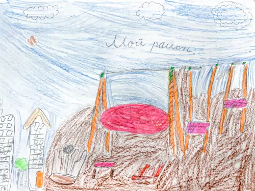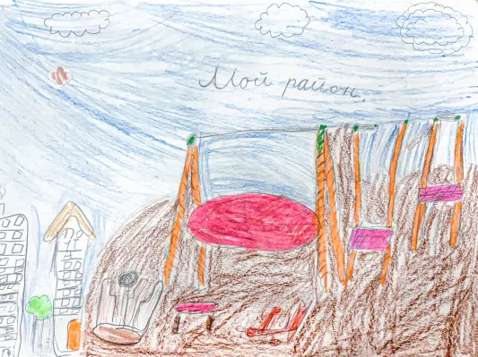 Моя работа нарисована цветными карандашами и восковыми мелками. Я очень люблю свой двор, у нас много площадок, качелей, песочниц, горок. Мне всегда интересно играть на наших площадках с моими друзьями.