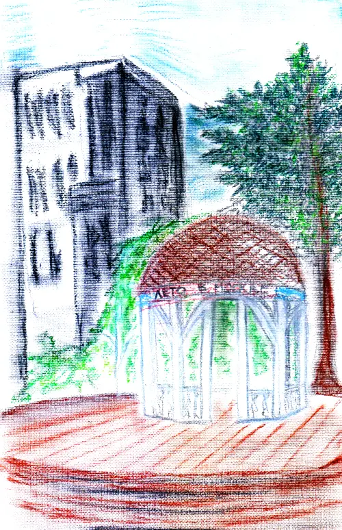 Работа выполнена пастелью на холсте. Изображена ротонда на бульваре имени Генерала Карбышева. Ротонда служит сценой для проведения различных мероприятий, таких как: концерты, мастер-классы и развлекательные программы, поэтому вдохновила на создание этой работы.