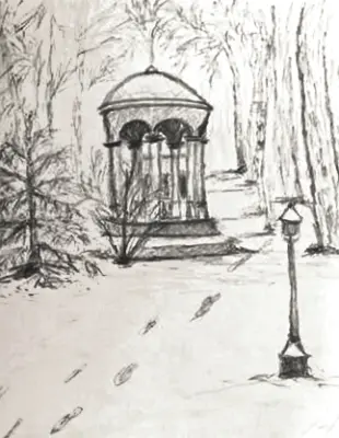 На рисунке изображена уютная беседка, расположенная в парке. Окружающая природа и спокойная атмосфера делают эту беседку идеальным местом для уединения или встречи с друзьями.