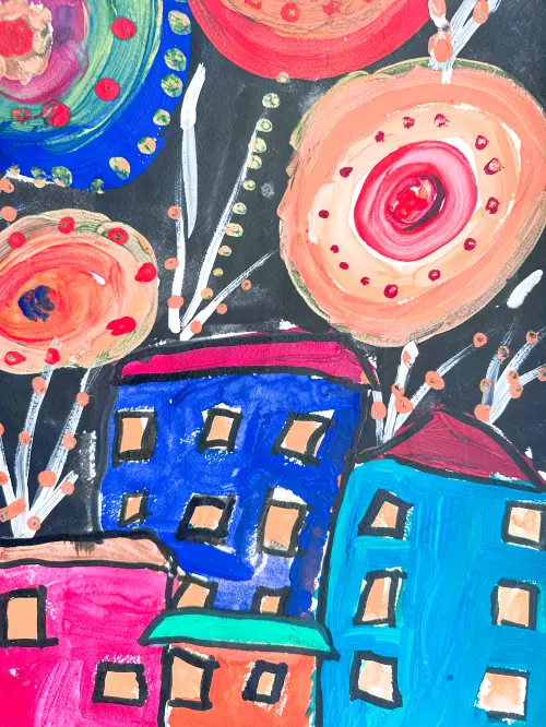 Салют Победы над Митино. Яркие и красочные всполохи освещают дома, превращая обычный двор в живописную картину, которую так и хочется нарисовать