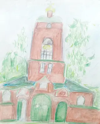 Художественная работа выполнена гуашью на ватмане. На картине изображена церковь Знамения Господня, которая находится в районе Щербинка. Храм расположен в живописном месте и является местом притяжения паломников, верующих людей и художников различного возраста.