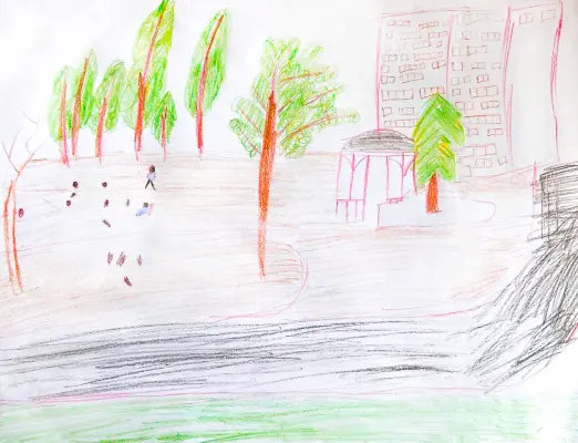 Рисунок ребёнка девяти лет показывает уютный уголок отдыха в Москве — ротонду на бульваре Генерала Карбышева. Центральное место на картине занимает сама ротонда — красивая беседка с колоннами, покрытая крышей, создающая ощущение покоя и уюта. Её форма полукруглая, линии лёгкие и плавные, а цветовая гамма тёплых оттенков подчеркивает её привлекательность.