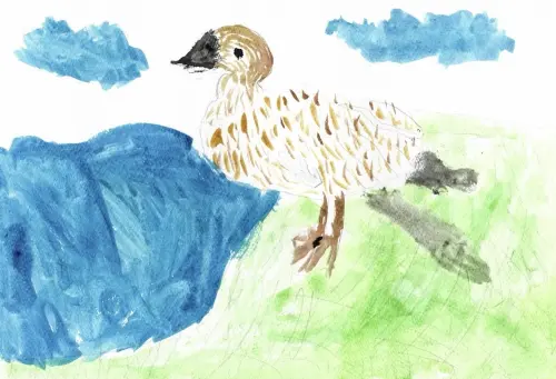 На рисунке изображена уточка, мирно плавающая по воде в Воронцовском парке. Яркие краски передают живописную атмосферу парка, отражённую в спокойной глади пруда. Уточка символизирует природу и гармонию, которые можно найти в городском оазисе, таком как Воронцовский парк.