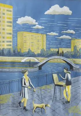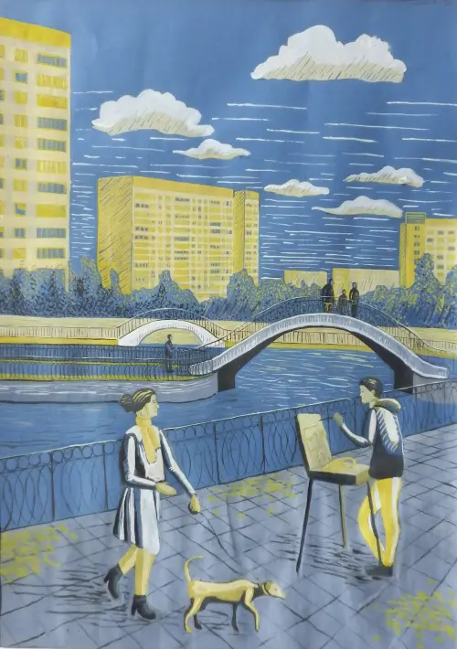 Я учусь в Художественной школе. Каждое лето мы проходим пленэрную практику. Мы рисуем природу, растения, животных, архитектуру. На данной работе изображен художник, старающийся изобразить красоту Михайловских прудов города Зеленограда.