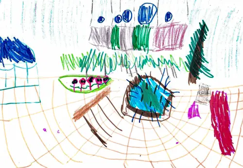 Рисунок четырёхлетней девочки рассказывает историю приятной прогулки с лучшей подружкой в прекрасном месте — около ротонды на бульваре имени генерала Карбышева. Основное внимание уделено девочкам, взявшимся за руки и весело шагающим вдоль красивых дорожек парка. Обе героини нарисованы крупными, заметными фигурами с большими глазами и улыбающимися лицами, что подчёркивает дружбу и хорошее настроение.
