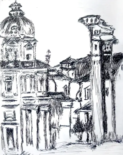 На рисунке «Архитектура города» изображён городской пейзаж с разнообразными зданиями, отражающими архитектурные стили разных эпох. Здания гармонично сочетаются друг с другом, создавая уникальный облик города.