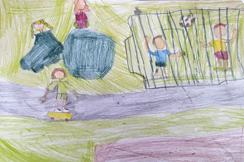 Я родилась и живу в прекрасном городе Москва. На моем рисунке ребята моего двора играют в футбол. А девочки болеют за победителей. Я очень люблю свой двор и свой район!!!