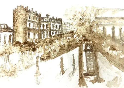 На этом рисунке изображена Новослободская улица — одна из тех, что создают особую атмосферу города. Этот рисунок передаёт тепло и характер улицы, её неповторимый стиль и настроение, приглашая зрителя окунуться в её атмосферу и почувствовать её душу.