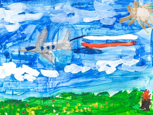 Перед Парадом Победы в мае Николай гулял во дворе и увидел, как проходил тренировочный полёт самолётов со шлейфом триколора. Это произвело на мальчика сильное впечатление, и он решил изобразить именно этот момент в своей работе.