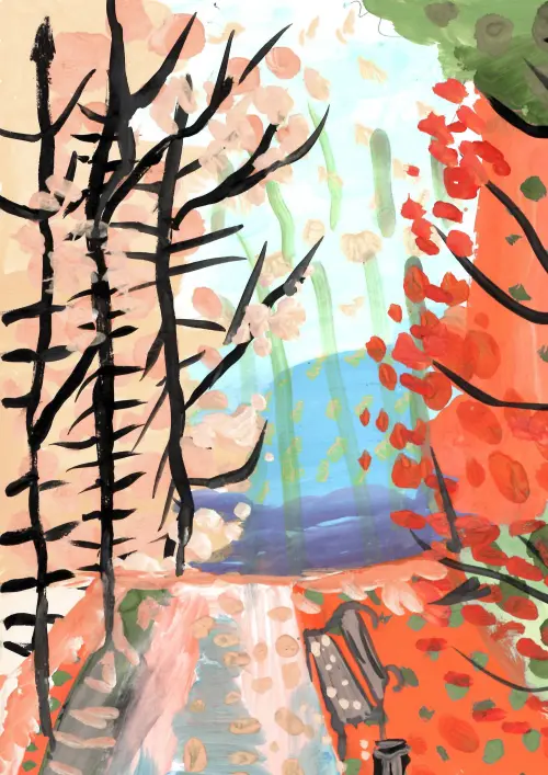 Я нарисовала наш парк осенью. Мы очень любим гулять там с папой и мамой. Мы с папой любим бегать по разноцветной листве. Она очень здорово шуршит. А мама сидит на лавочке и фотографирует нас.
