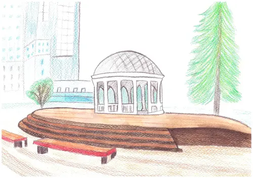 На моём рисунке изображена ротонда на бульваре Карбышева. Это одна из достопримечательностей района Хорошёво-Мнёвники. Летом здесь работает окружная площадка проекта «Лето в Москве».