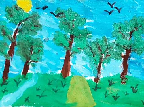 Милана любит гулять с дедушкой в парке «Кусково». В своей работе она изобразила тенистую аллею лесопарковой зоны, а в небе летят птицы. Глядя на картину, можно легко представить, какой свежий воздух в парке, какие красивые высокие деревья... Милана много рассказывает про парк.