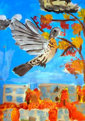 Анастасия изобразила осень в тихом уютном дворе. Из рассказа девочки стало известно, что во дворе растет много кустов рябины, осенью, когда ягоды рябины стают красными, прилетают птицы чтобы полакомиться вкусными ягодами.