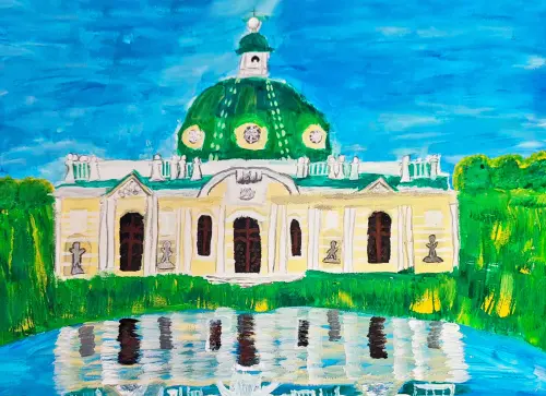 Мария любит бывать с родителями в парке «Кусково». Это историческое место навевает фантазии, которые девочка изобразила в своей работе. Именно таким увидела Мария дворец в парке «Кусково» и перед ним чудное озеро... Красота!