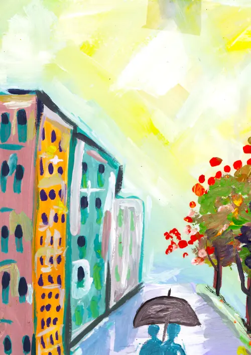 Также как все мои одноклассники, я с нетерпением ждала начала летних каникул. Но июнь погодой не порадовал. В своей работе я изобразила мой двор: унылое небо, дождь и прохожие под зонтами...