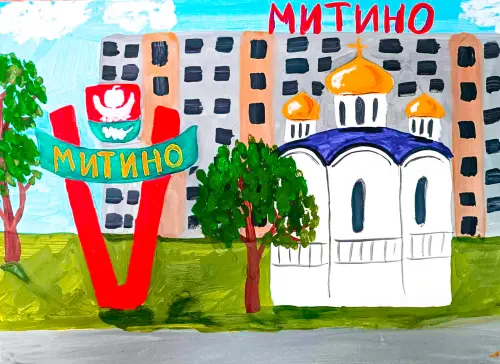 Эта творческая работа выполнена ребёнком красками и представляет собой яркий и красочный взгляд на район Митино. В центре внимания находится семейный дом, окружённый зеленью и передающий чувство теплоты и уюта. Особое место занимает символ района — изящная ладья, воплощающая историю и дух местности. Её плавные линии гармонично сочетаются с силуэтом православной церкви, возвышающейся неподалеку. Этот архитектурный элемент добавляет рисунку глубину и торжественность, отражая важность духовного наследия и культурного разнообразия района.