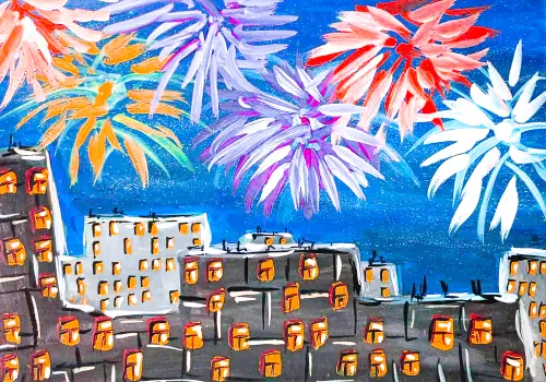 Творческая работа выполнена юным художником красками. Картина посвящена любимому району, показанному в особенный момент праздника, когда ночное небо озаряется праздничным фейерверком.