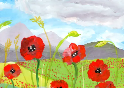 Хоть я и живу в городе, но иногда я лежу и фантазирую. Я представляю, что у моего окна прямо во дворе раскинулось широкое поле, где цветут яркие маки. А за ним виднеются могучие горы.