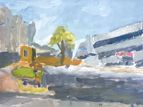 На холсте перед зрителем предстал замечательный творческий труд юного художника, созданный красками. Художник воспроизвел памятный уголок своего района Митино, запечатлевший значимый объект городской инфраструктуры — первый построенный в данном месте торговый центр.