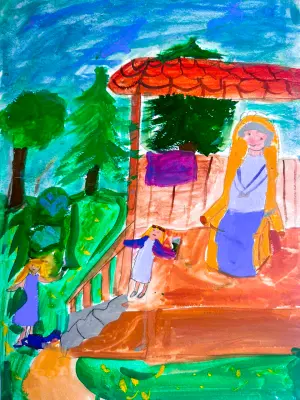 Представленная работа создана ребёнком красками и посвящена одному из любимых мест отдыха семьи — игровой площадке в родном районе. Главный акцент сделан на тёплые семейные прогулки: центральная часть композиции занята фигуркой мамы, держащей за руки малышей, весело прогуливающихся среди игровых конструкций площадки.