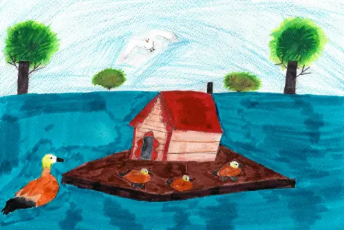 На рисунке изображён пруд в Воронцовском парке — одно из моих любимых мест в Москве. Здесь можно наблюдать, как утки плавают у деревянного домика на воде, а вокруг раскинулись зелёные деревья. Это место вызывает чувство уюта и умиротворения. Я выбрала его для рисунка, потому что именно здесь люблю отдыхать, гулять и наслаждаться природой вдали от городской суеты.
