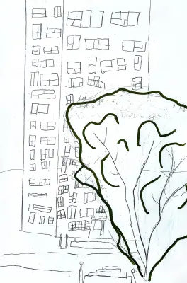 Вот наш дом. Видишь, я не просто квадрат нарисовал! Я показал окна разные, это креатив, и стены крепкие. Это важно для проекта! А вот самое главное – вход в подъезд. Там ступеньки, дверь с ручкой, и даже козырек сверху, чтобы дождь не капал. Без козырька – плохой проект!