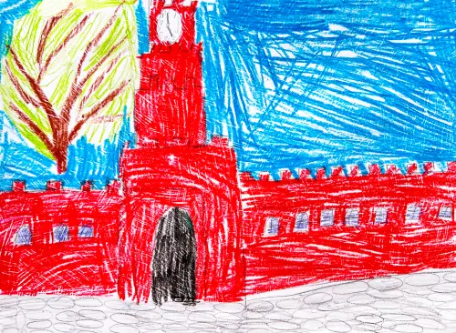 На моем рисунке изображена Красная площадь – главная площадь Москвы, символ России с богатой историей. Рисунок выполнен восковыми мелками. Я изобразил Спасскую башню – она самая известная башня Кремля с курантами (часами), через которую выходят высокие гости.
