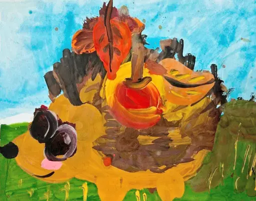 На рисунке изображен ёжик. Он собрал листочки и яблоки и несёт их к себе в дом, чтобы порадовать семью. У ёжика хорошее настроение, он улыбается. Ему нравится собирать листочки.