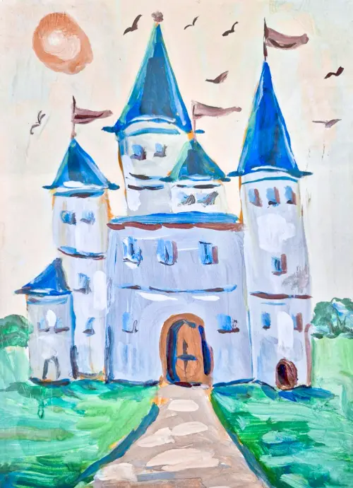 На данной картине представлен район Новогиреево в виде волшебного замка, потому что именно так Витя представляет свой район: как красивое воплощение сказки.