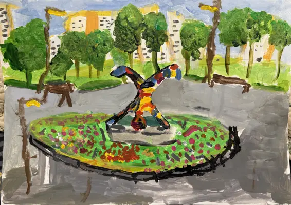 На рисунке изображена Инсталляция расположенная в Дюссельдорфском парке района Марьино - «Ребенок, делающий колесо». На создание этой работы юного художника вдохновили веселые прогулки по любимому парку.