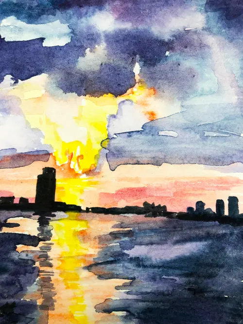 Я часто гуляю около Алтуфьевского пруда, потому что там видно самые красивые закаты, которые отражаются в воде и озаряют небо. Однажды я увидел этот закат, сделал фото, а потом рисунок акварелью.