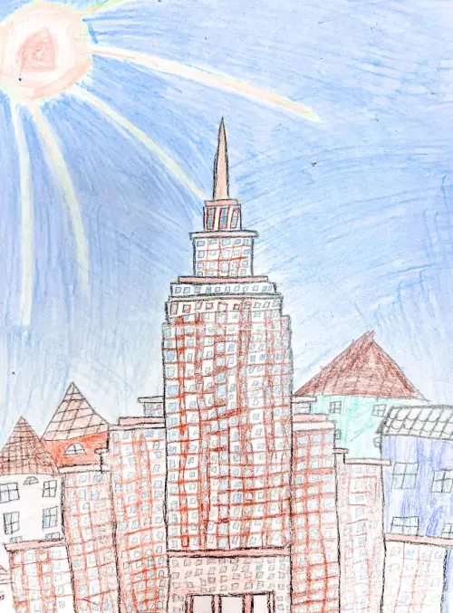 Мой рисунок выполнен цветными карандашами, я нарисовал высотку Триумф Палас. Триумф Палас – это очень высокий и красивый жилой дом в Москве, похожий на замок из сказки! Он стоит и сверкает огнями вечером.