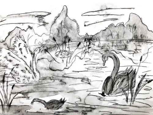 Лебеди - самые красивые птицы! Такие изящные, белоснежные, с удивительными большими крыльями. Я люблю смотреть на них, когда гуляю вокруг пруда в Лианозовском парке. Техника гуашь.