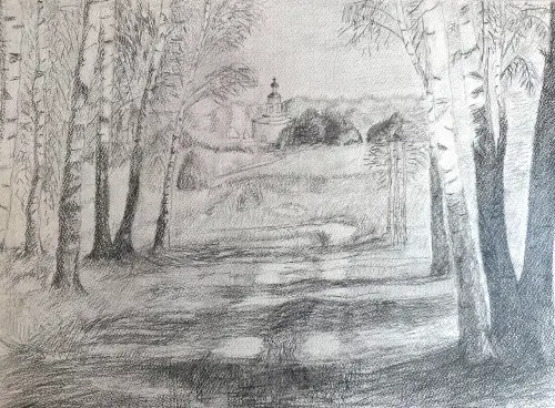 Екатерина обучается в художественной студии КЦ "Митино". Работа выполнена в графике. Сюжет рисунка - прогулка в летнем парке, где вокруг очень много зелени и поют птицы.