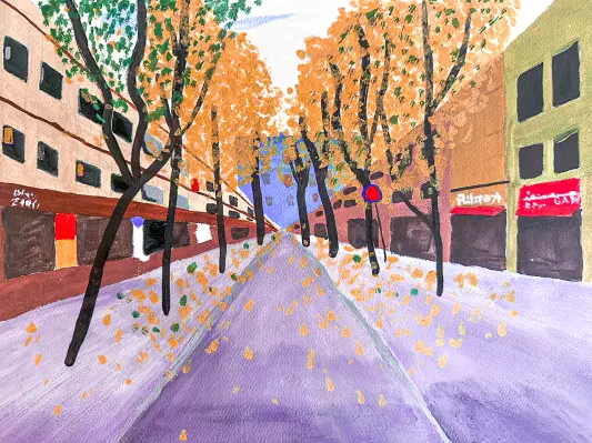 Кристина занимается в художественной студии КЦ Митино. Работа выполнена гуашью. На рисунке изображен бульвар осенним ранним утром, когда еще все люди спят, магазины закрыты, и только шелест листьев нарушает тишину и покой начала нового дня.
