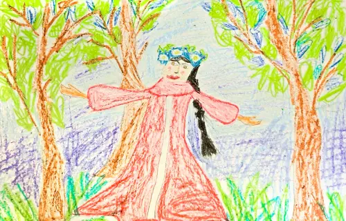 В танце Марья кружится, кружится, среди зеленых деревьев, среди цветов, под пение птиц и шелест листьев на ветру. Гармония природы в танце и звуках.