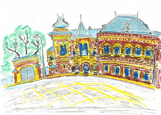 30 марта 1851 г. жена петербургского купца Вера Яковлевна Игумнова купила за 17140 руб. серебром участок с домом у купчихи В.Д. Крашенинниковой. Начинается история владения Игумновых на Якиманке. Но главные деловые интересы Игумновых были в Ярославле. Еще в 1857 г. Большая Ярославская мануфактура (текстильная фабрика начала XVIII в.), была куплена купцами Карзинкиными и Г.М. Игумновым. В 1888 г. Игумнов скончался. Его наследник, Николай Васильевич Игумнов, в том же году решает построить себе дом в Москве и заказывает проект ярославскому архитектору Н.И. Поздееву (1885–1893). Первый вариант проекта предполагал использовать стены старого двухэтажного дома, стоявшего на этом месте. Потом от этого варианта отказались, что позволило архитектору свободно размещать здание на участке, добиваясь максимальной выразительности образа. Вместе с тем, здание не выбивалось из ряда ампирных особняков вдоль Якиманки, лишь немного превышая их по размерам, но контрастируя богатством отделки.Работа нарисована пастелью.