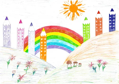 Этот год очень дождливый. После грозы над моим любимым районом Чертаново Северное часто появляется радуга, иногда она бывает двойной. Я изобразила дома необычной формы, так как я мечтаю стать архитектором и проектировать современные комфортные и красивые дома.