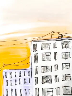 Я живу в высотном доме, и у нас из окна видны потрясающие рассветы и закаты. Один из таких огненных вечеров я запечатлела на рисунке. Очень хотелось попробовать технику скетчинга.